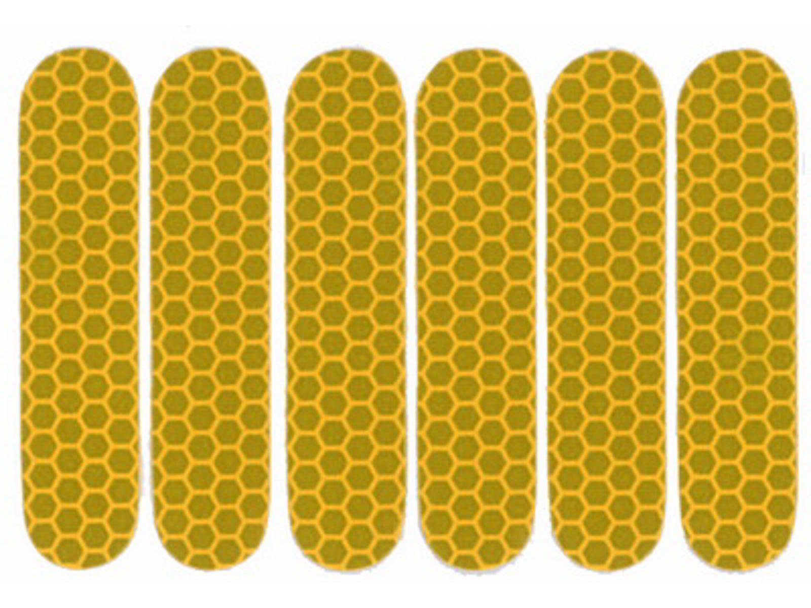 Refleks ark med 6 stk. klæbe mærkater/refleks klistermærker i gul, som kan sættes på hjul med høje fælge eller på cykel anhænger og lignende. De er dog bedst anvendt på forholdsvis flade flader.