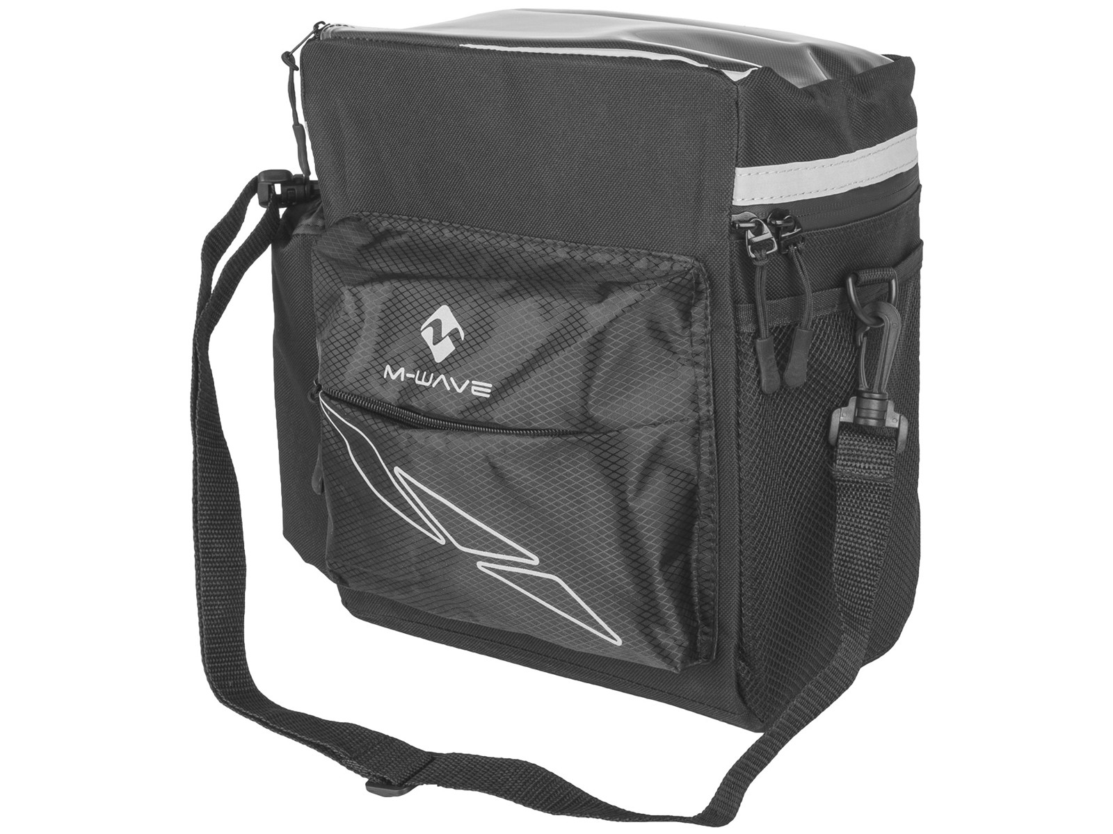 Denne cykeltaske monteres på styret, og er derfor ideel som cykelkurv, og opfylder mange behov med nem af- og påmontering samt opbevaringmuligheder. Det store rum kan bl.a. indeholde pung, mobiltelefon, snacks eller solbriller uden problemer. Derudover har tasken to eksterne rum samt en sidelomme til f.eks. drikkedunk. Øverst er der en transparent lomme til mobiletelefon eller kort.