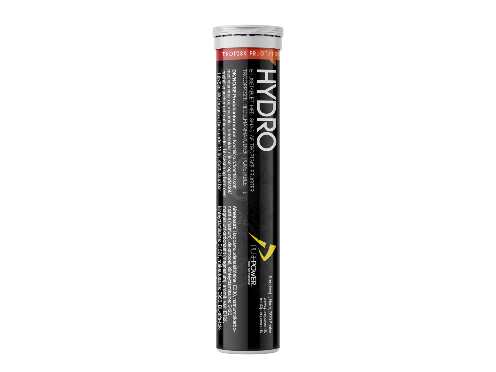 Surhedsregulerende midler: E330, natriumbicarbonat, dextrose, konsistensmiddel: E420, magnesiumcarbonat, aromaer, farve: E162, konsistensmiddel: E1521, sødestof E955, DL-alpha-tocopherlylacetat (E-vitamin), nikotinamid (niacin), farve: E101, pyridoxinhydrochlorid (vitamin B6).