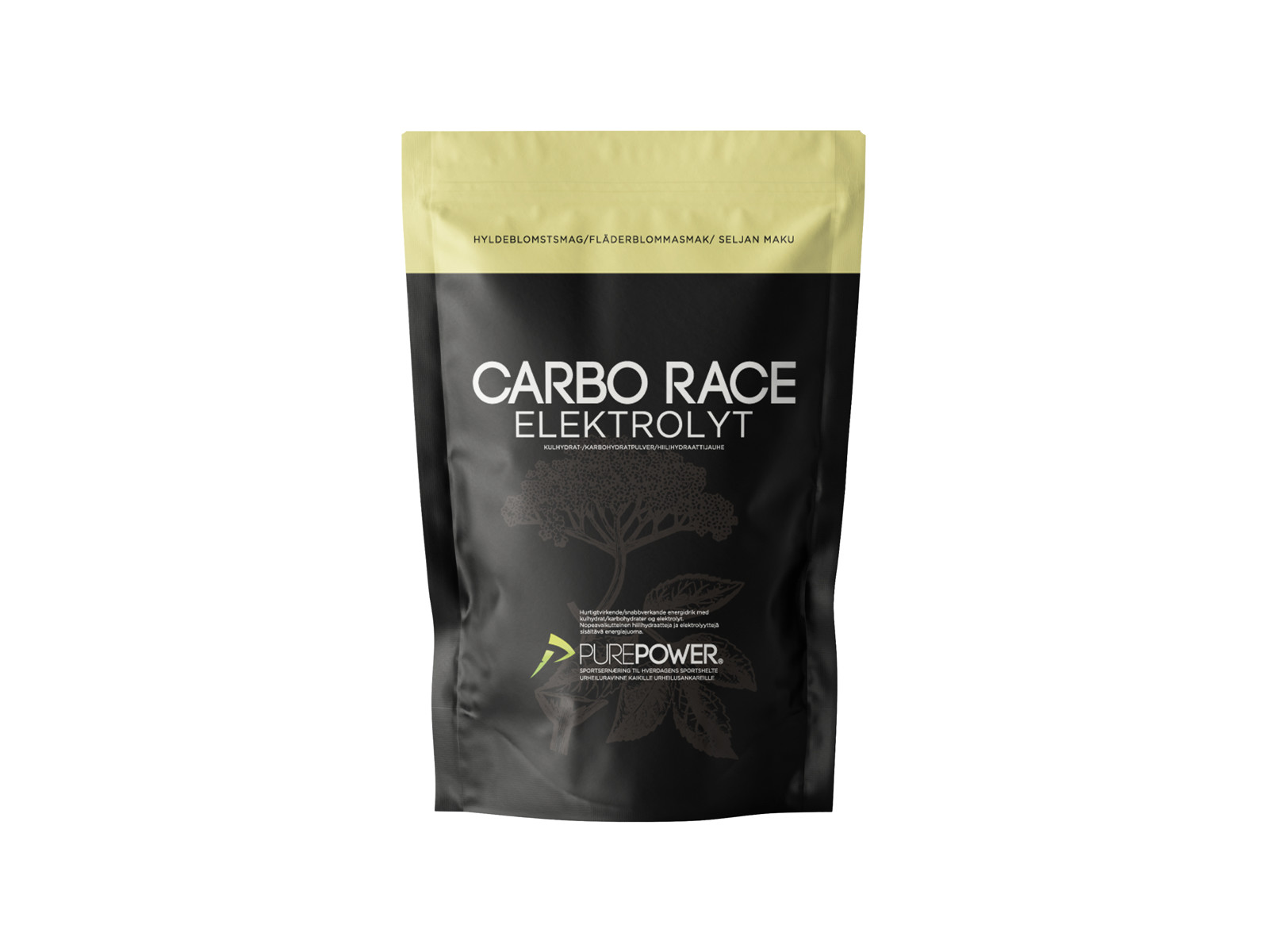 PurePower Carbo Race elektrolytdrik med en forfriskende smag af hyldeblomst, som leder tankerne hen på en læskende sodavandsis. Dette energipulver tilfører dit vand et særligt indhold af mineraler, som øger optagelsen af vand i kroppen, og mindsker risikoen for dehydrering under fysisk træning.