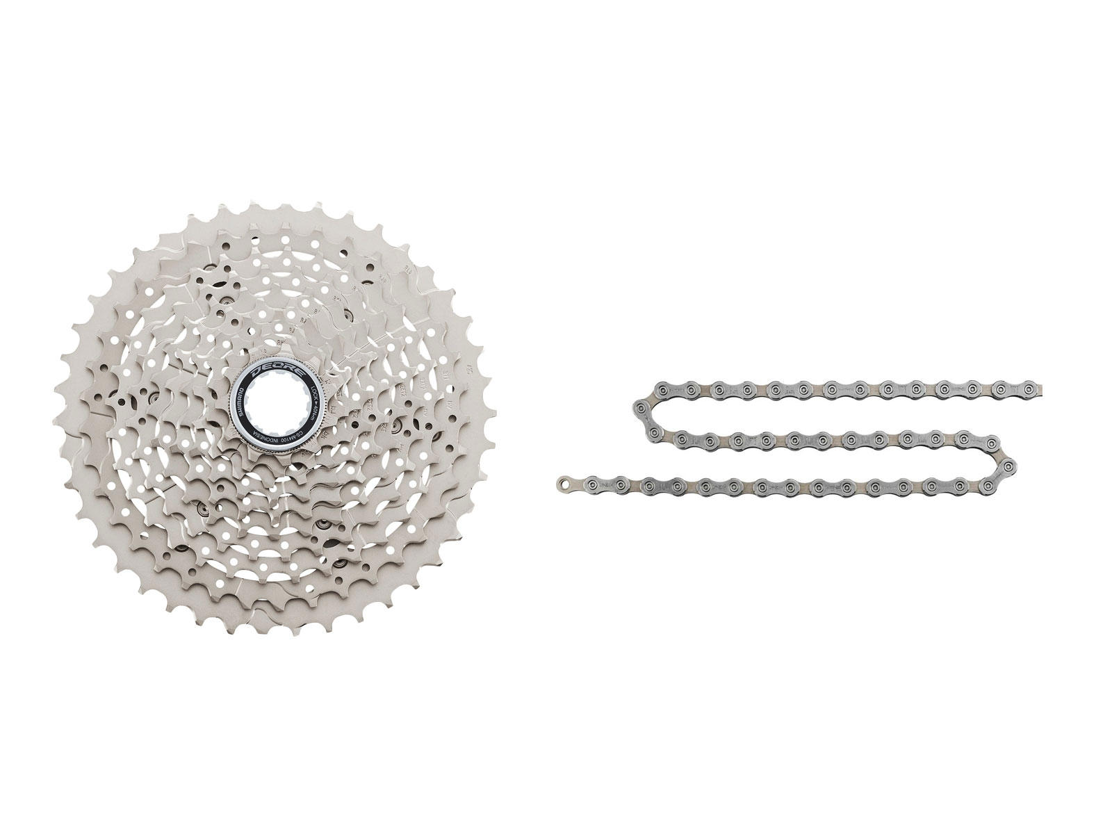 Når man skifter sin kassette så skal der også skiftes kæde og begge dele får du i denne bundle. Sættet består af Shimano Deore 10 gears kassette med gearinterval 11-36 tand og Shimano HG54 kæde som passer dertil og desuden er der samle stift med til kæden.