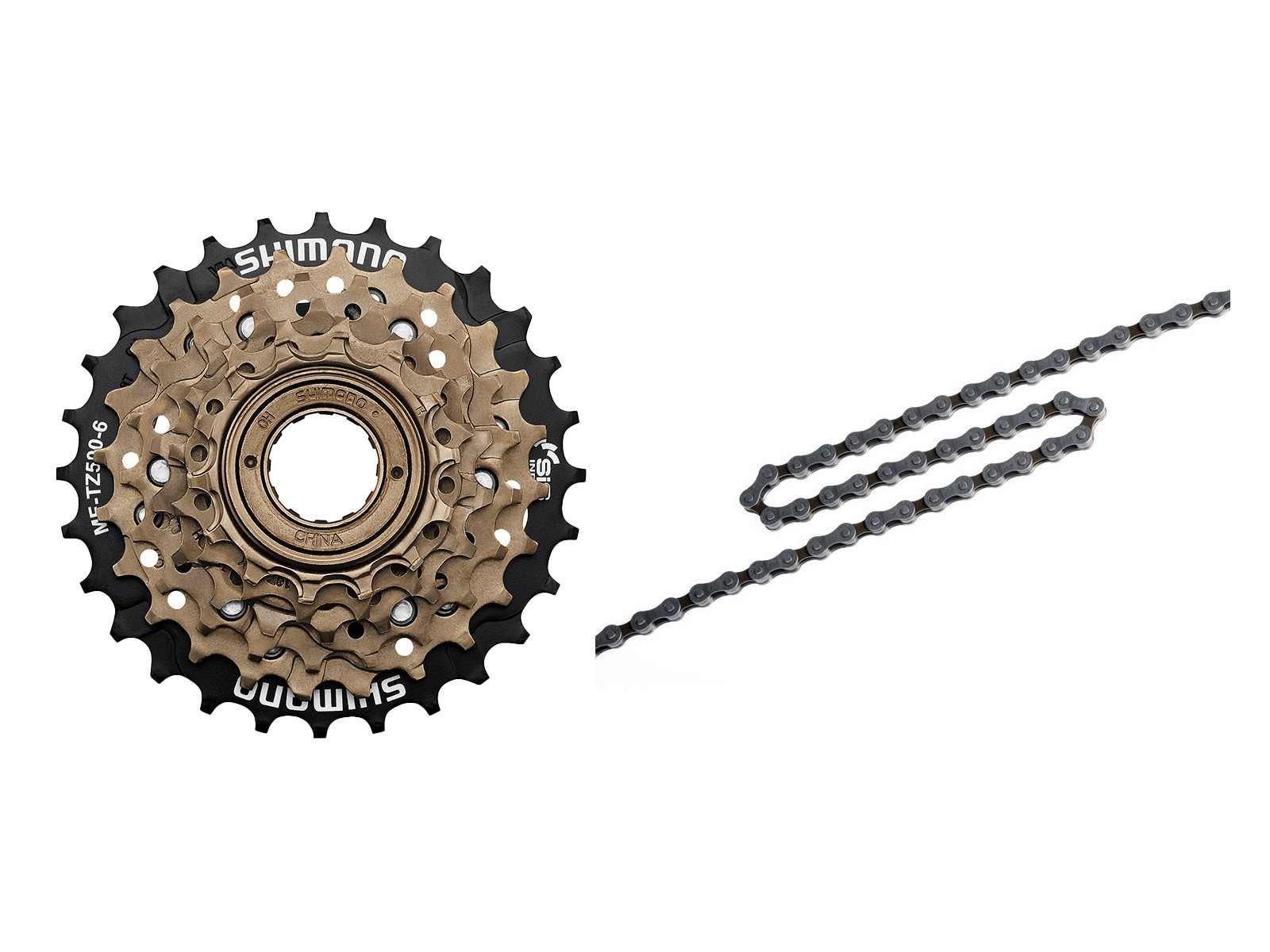 Når man skifter sin frikrans så skal der også skiftes kæde og begge dele får du i denne bundle. Sættet består af Shimano TZ500 6 gears frikrans med gearinterval 14-28 tand og Shimano HG40 kæde som passer dertil og desuden er der samle led med til kæden.