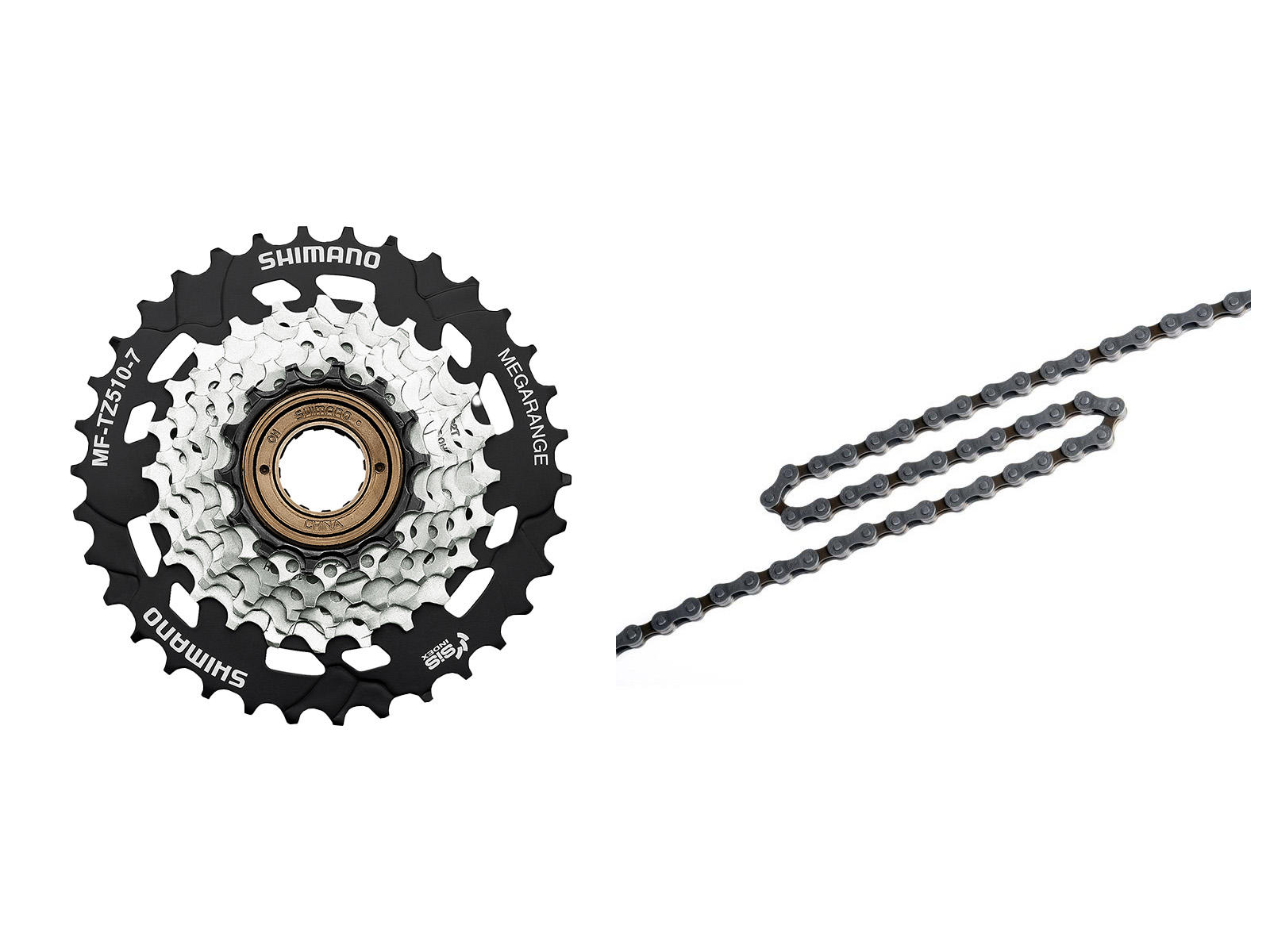 Når man skifter sin frikrans så skal der også skiftes kæde og begge dele får du i denne bundle. Sættet består af Shimano TZ510 7 gears frikrans med gearinterval 14-28/34 tand og Shimano HG40 kæde som passer dertil og desuden er der samle led med til kæden.