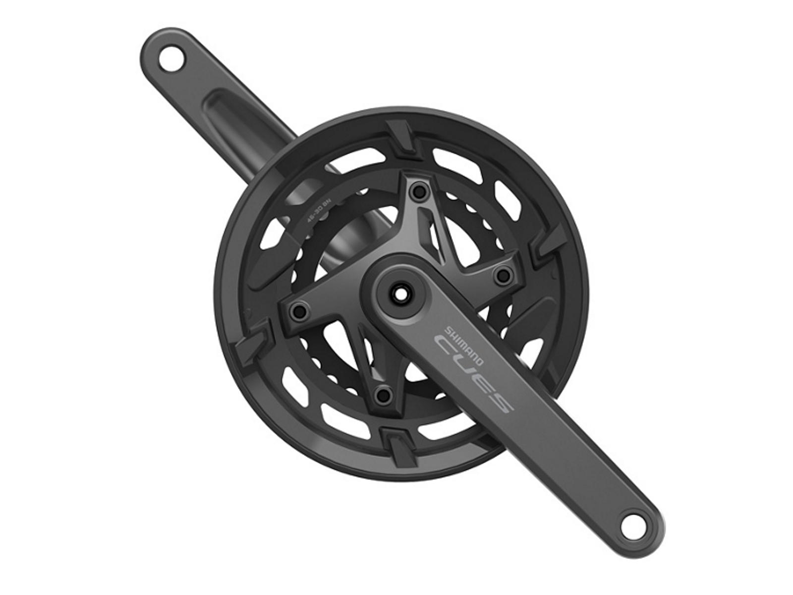 Dette Shimano Cues FC-U6000-2 dobbelt kranksæt er med 46 og 30 tands klinger, kædeskærm, 175mm lange pedalarme som er til integreret krankaksel. Kranksættet kan bruges sammen med 9 eller 10 gears kassette og kan kombineres med øvrige Shimano gruppekomponenter med samme gearinterval. Sættet består af højre og venstre pedalarm samt klinger.