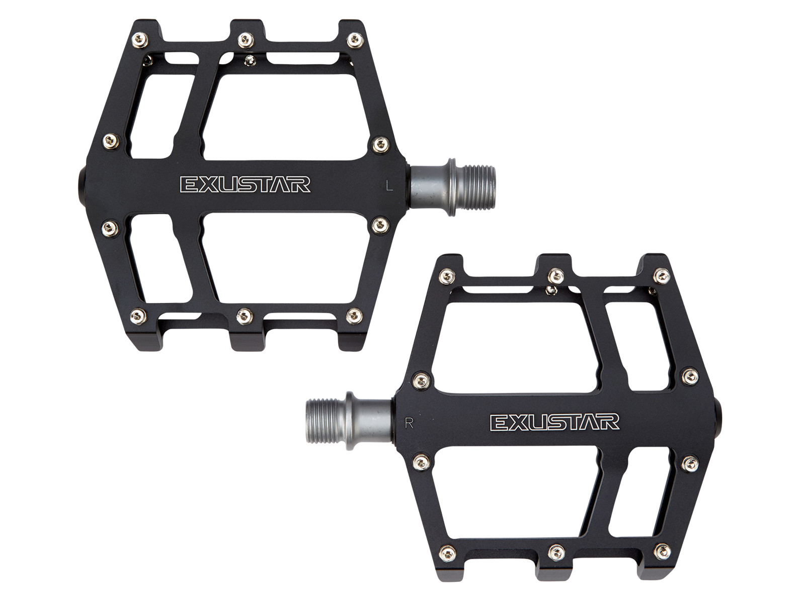 Disse Exustar platformspedaler henvender sig til både BMX, MTB og Freeride brug. Pedalerne er med hele 10 pins på begge sider, som sørger for, at foden ikke skrider hen over pedalen under brug og giver en rigtig følelse af kontrol. Desuden er pedalens krop produceret i et stykke CNC fræst 6061 aluminiumslegering, som er anodiseret og med udskiftelige pins. Pedalakslen er af varmebehandlet CNC fræset chrom, molybdæn stål med lukkede og forseglede lejer, som minimerer friktion.