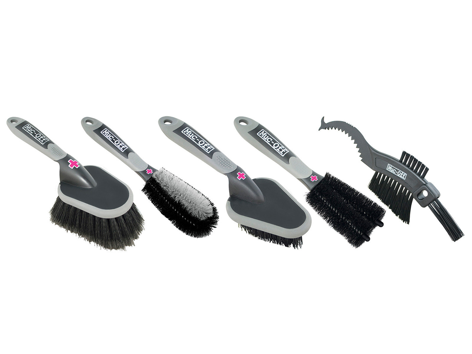 Sættet leveres med fem børster, som hver har fem funktioner. Fælles for alle børster er, at de har et godt gummigreb, som ikke glider under våde forhold, og som ligger godt i hånden. Den første børste er Muc-Off's Soft Washing Brush, som er designet til at rense dit stel og komponenter. Den anden børste i pakken er Detailing Brush, som er ideel til at fjerne snavs på tandhjul, nav og andre stramme områder, som ophæng eller gafler. Den tredje børste som pakken indeholder er Muc-Off's Claw Brush, som har et tredobbelt børstehovede med hårde nylon børstehår samt en integreret børste til at fjerne mudder fra tilstoppede sko. Claw børsten er ideel til kæde, kasette samt tandhjul. Pakkens fjerde børste er en Wheel & Component Brush, som er formet og har konturer specielt til at rense fælde og eger, så det bliver en leg. Den sidste og femte børste er Two Brong Brush, som er perfekt, når du skal fjerne snavs på eger, skiver, forbindelser eller pedaler; og med disse fem børster er du virkelig godt udstyret, når cyklen skal rengøres.